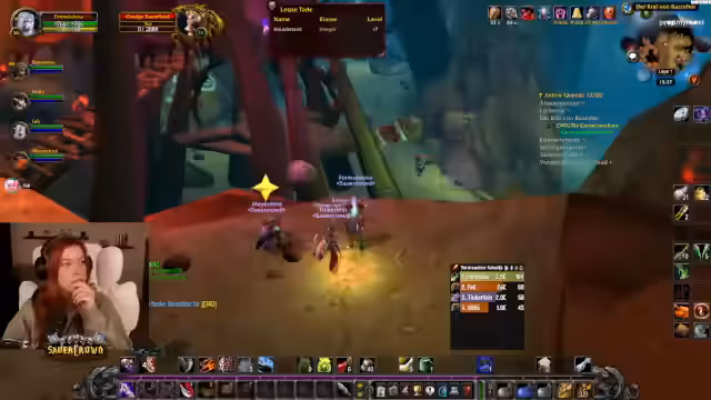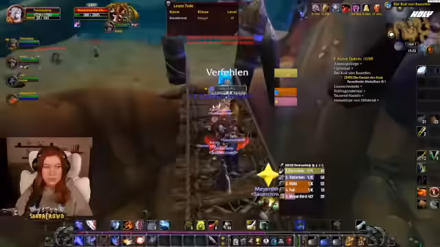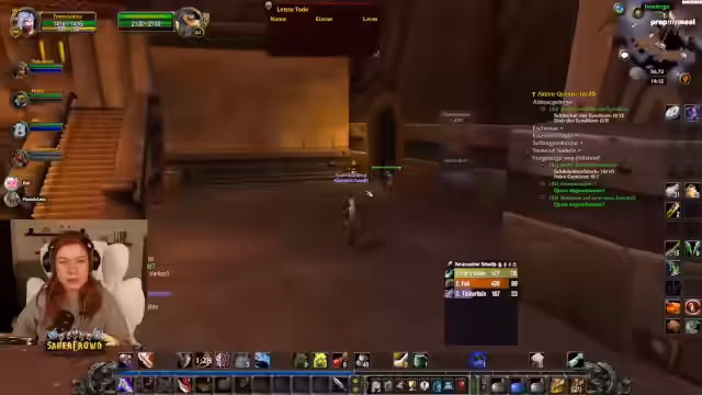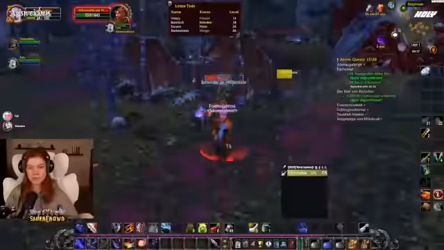 05:20:47Ein technischer in-game-Fall führt zu einem humorvollen, aber nervigen Spielproblem. Die Streamerin erhält einen Debuff namens 'Fluch der Herzschünde', der sie periodisch betäubt und zu Fall bringt. Dieser Fluch ist Teil einer Schurken-Quest und muss innerhalb einer bestimmten Zeit entfernt werden, sonst stirbt der Charakter. Dies sorgt für ständige Unterbrechungen im Spiel und beschäftigt die Streamerin stark, da sie ständig vorsichtig sein muss. Sie wirkt dabei leicht genervt, aber auch amüsiert von diesem 'asozialen' Debuff, der das Questen erheblich erschwert und sie immer wieder aufhält.