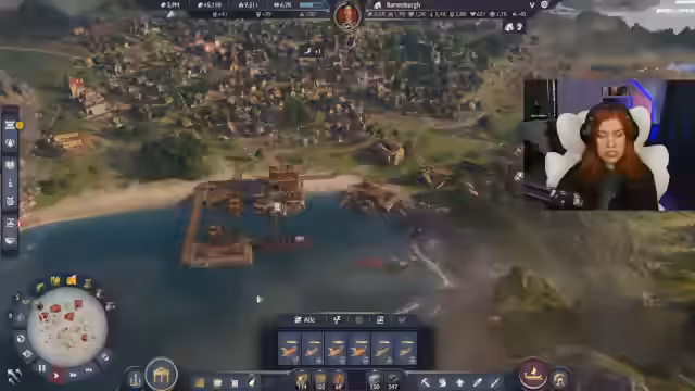 00:40:58Ein zentraler Aspekt des Streams ist der kreative Städtebau. Die Streamerin legt Wert darauf, dass jede Insel, auch die rein funktionale Produktionsinsel, grün und dekoriert wird. Sie experimentiert mit organischeren Bauweisen anstatt standardisierter Blöcke und kritisiert, dass es in Anno schwierig ist, Mauern perfekt an Häusern anzuschließen. Trotz des Fokus auf die Funktion der Fiebelproduktion werden immer wieder Ornamente, Bäumchen und Feuerschalen platziert, um den Wohnkomfort und das Stadtbild zu verbessern und die Zufriedenheit der Bewohner zu steigern.