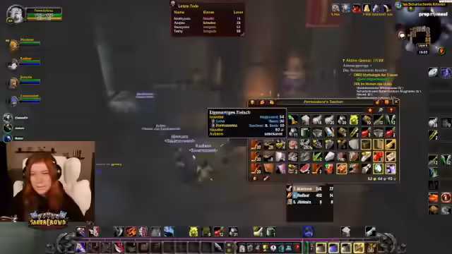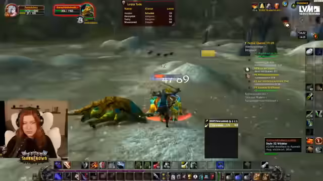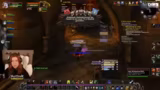 04:35:38Die Gruppe beginnt mit dem Kampf und die Taktik ist, zunächst alle Mobs zu töten, bevor man sich dem Boss widmet. Man markiert sich mit dem Mondsymbol. Der Streamer wird von einer Zuschauerin als "Schurkin" angesprochen und eine Schurke erscheint zufällig. Man öffnet eine Kiste und findet einen Helden, der aufsteht, aber sogleich wieder besiegt wird. Man findet Loot wie Blitzdestillat, schweres Leder und Zinnerz, den niemand benötigt. Nach dem Kampf geht man nach unten, um nach Rare Mobs zu suchen, was aber scheitert.