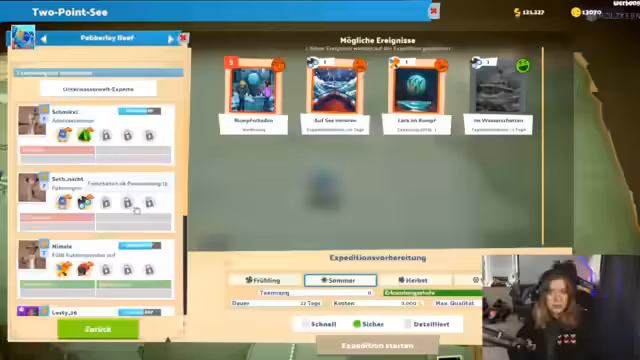 04:06:56Während des Streams werden zufällige Events wie "Expeditionsdilemmata" behandelt, bei denen strategische Entscheidungen getroffen werden müssen. Der Chat wird in Abstimmungen einbezogen, um über das Vorgehen zu entscheiden. Gegen Ende des Streams kündigt die Streamerin ihren weiteren Zeitplan an, der weitere Two Point Streams und einen Switch zu Assassin's Creed umfasst, und schließt den Stream mit einem Raid auf den Kanal "Onkel Schneemann".