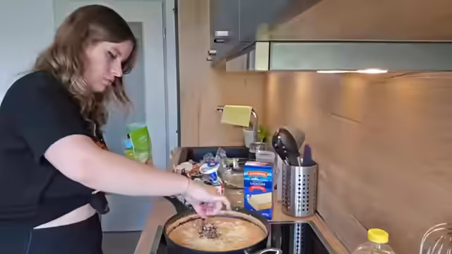 01:56:09Die Lasagne-Sauce wird nun mit Salz und Pfeffer abgeschmeckt, während der Ofen auf 220 Grad Ober-/Unterhitze vorgeheizt wird. Die Streamerin bereitet zwei kleinere Auflaufformen vor, da sie keine große Form besitzt. Sie erklärt den Schichtvorgang: erst Tomatensauce auf den Boden, dann Lasagneplatten, wiederholt dies und belegt die oberste Schicht mit Käse. Gleichzeitig plant sie zukünftige Kochstreams, darunter ein Anno-Kochbuch-Projekt und ein gemeinsames React-Event der Serie 'Feuer und Flamme'.