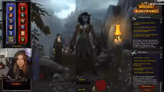 00:07:32Nach dem Start des Spiels stellt die Streamerin fest, dass es noch herunterlädt, was sie aber nicht stört, da das Spielen parallel möglich ist. Der Fokus liegt auf der Erstellung eines neuen Priester-Charakters für die Allianz. Nachdem der gewünschte Name bereits belegt ist, wird ein neuer gewählt. Der Charakter, ein Worgen-Priester, wird im Startgebiet von Gilneas erstellt. Der Stream zeigt die düstere und zerstörte Atmosphäre von Gilneas, während die ersten Quests angenommen werden, die das Verteidigen der Stadt gegen die Geißel und Worgen beinhalten.