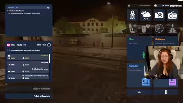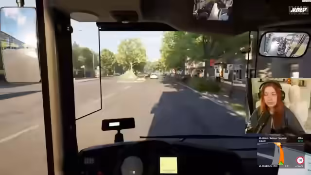 04:03:38Die Streamerin beginnt ihre erste Fahrt im Bus-Simulator in Berlin. Sie kämpft anfangs mit der Steuerung und der Orientierung. Das Hauptziel ist es, pünktlich zu fahren und die Fahrkarten der Fahrgäste korrekt zu verkaufen. Dabei zeigt sie die Funktionen des Spiels, wie das Drücken der Blinktasten mit E und Q und die verschiedenen Fahrkartenoptionen, wie Einzelfahrscheine und Tageskarten.