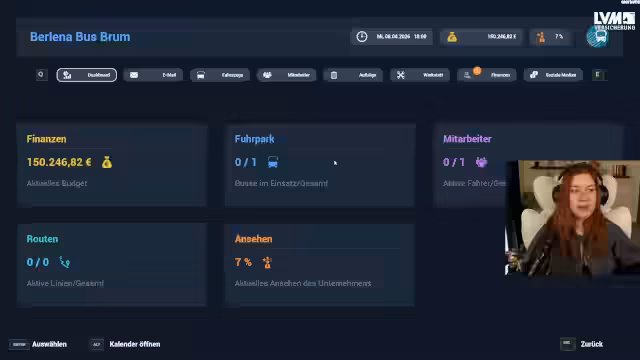 01:29:01Im The Bus Simulator beginnt die Streamerin, im Wirtschaftsmodus ihr eigenes Busunternehmen aufzubauen. Nachdem sie ein Büro und einen Stellplatz gemietet sowie eine Haftpflichtversicherung abgeschlossen hat, steht die Finanzierung an. Da das Budget nicht ausreicht, muss sie einen Kredit aufnehmen, was ihr persönlich widerstrebt, da sie Schulden ablehnt. Sie entscheidet sich für einen Kredit von 250.000 Euro. Anschließend sucht sie im Fahrzeugmarkt nach einem ersten Bus und entscheidet sich nach Abwägung von Platz, Preis und Versicherung für einen gebrauchten Doppeldecker mit 83 Sitzplätzen.