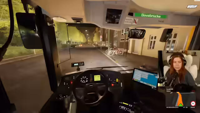 02:08:51Die erste Fahrt im Bus Simulator gestaltet sich schwierig. Die Streamerin startet vom Depot aus und muss zunächst zum Startpunkt der Touren. Sie stößt auf mehrere technische und spielbedingte Herausforderungen: Die Fahrzeugsteuerung mit Maus und Tastatur ist unpräzise, die Kamera ändert ständig den Winkel, und die Türen öffnen sich automatisch bei jedem Halt, was sie als extrem nervig empfindet. Ein Navigationsfeuer und mangelnde Kenntnisse des Berliner Stadtplans führen zu Missverständnissen und fast zu einem Unfall, was die Fahrt deutlich erschwert.