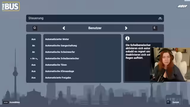 02:26:10Der Stream beginnt mit der Navigation durch Berlin, wobei die Streamerin die Strassen erkennt und auf der Busspur bleibt. Sie bricht die Fahrt ab, da sie die Einstellungen umstellen muss. Im Hauptmenü navigiert sie zum Wirtschaftssystem und zur Steuerung, wo sie den Arcade-Modus als unpassend findet. Sie entscheidet, die automatischen Türen auszuschalten, während die Klimaanlage und andere automatische Freigaben aktiv bleiben. Die Streamerin erwähnt ihr unbenutztes LKW-Lenkrad und den Wunsch, dies zukünftig im Racing Rig zu nutzen.