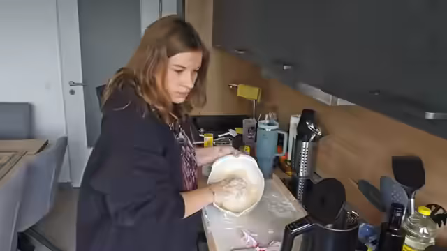 00:18:36Die Streamerin beginnt mit der Zubereitung des Teigs, wobei die Hefe mit Honig vermischt und anschließend Wasser hinzugefügt wird. Es stellt sich die Frage, ob das Wasser warm sein soll, da unterschiedliche Angaben in verschiedenen Rezepten gefunden wurden. Letztendlich entscheidet sie sich für 45 Grad warmes Wasser, um die Hefe nicht zu schädigen. Es wird ein Topf zum Erhitzen des Wassers verwendet und die Streamerin äußert ihre Begeisterung für das Backen und Kochen im Herbst. Die Hefe wird mit Honig vermischt, um sie zu verflüssigen, und das Wasser wird aufgesetzt. Die genaue Temperatur des Wassers kann am Wasserkocher eingestellt werden. Ein Schluffi-Look wird präsentiert, da es ein gemütlicher Sonntag sein soll. Ein Esslöffel Honig wird zur Hefe gegeben und die Streamerin zeigt die Konsistenz der Mischung. Das Wasser ist fertig und wird warmgehalten. Es wird über die ideale Temperatur für die Hefe diskutiert, da zu hohe Temperaturen die Hefe abtöten können. Die Hefe-Honig-Mischung wird abgekühlt, um die Hefe nicht zu schädigen. Wasser und Salz werden hinzugefügt, gefolgt von einem Kilo Mehl, das nach und nach unter ständigem Rühren hinzugegeben wird. Es wird über die richtige Konsistenz des Teigs diskutiert und ob ein Schneebesen oder eine Gabel zum Rühren verwendet werden soll. Die Streamerin wechselt zur Gabel, da der Teig zu fest wird.