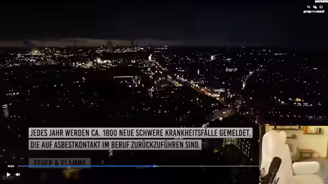 01:53:56Während der Löscharbeiten stellt das Team fest, dass das Gebäudedach aus asbesthaltigen Faserzementplatten besteht. Die Asbestfasern sind für die Feuerwehrleute eine extreme Gesundheitsgefahr, da sie hochkrebserregend und lungengängig sind. Es wird beschrieben, wie das Team durch das Tragen spezieller Schutzmasken und durch die strikte Decontamination nach dem Einsatz versucht, sich zu schützen. Die gesundheitlichen Risiken, insbesondere die lange Latenzzeit bis zum Ausbruch von Krankheiten, werden als erheblich angesehen.