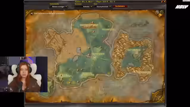 02:11:28Zurück im Spiel, wechselt die Streamerin nach Beutebucht. Sie nutzt das Astrale Rückruf-Portal, um dorthin zu reisen. Die Streamerin findet es gut, dass in TBC sammelbare Objekte glitzern, was das Finden erleichtert. Sie gibt an, dass die Bodenobjektdichte oft runtergesetzt wird, um die Objekte besser erkennen zu können.