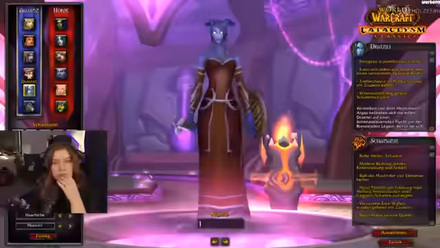 05:45:58Die Streamerin entscheidet sich, einen neuen Charakter als Schamanen mit Fokus auf Heiler (Heal) zu leveln. Dabei diskutiert sie, ob sie zuerst die Heiler-Talente maxt oder direkt mit Elementar (Ele) beginnt und später mit Dual-Spec auf Healer umstellt. Ihr Ziel ist es, später Dungeons zu heilen und freut sich bereits darauf, da sie dieses Spielprinzip als sehr cool empfindet.