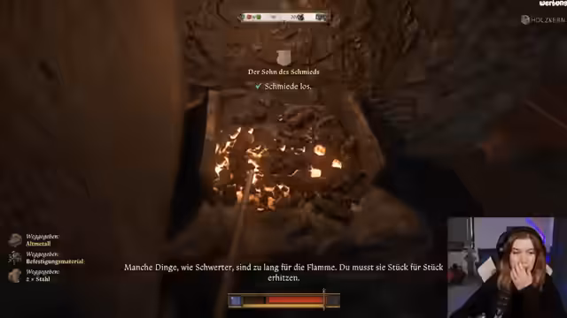 05:25:50Eine Hauptaufgabe führt die Streamerin zum Dorfschmied. Ihr wird befohlen, Jagdschwerter zu schmieden. Sie lernt die grundlegende Mechanik: einen Rohling erhitzen und mit dem Hammer gleichmäßig formen. Nach mehreren missglückten Versuchen gelingt ihr schließlich die Herstellung zweier Schwerter. Anschließend erhält sie eine neue Aufgabe, Äxte und Hufeisen zu schmieden, und erfährt, dass sie in der Schmiede über ein eigenes Bett zum Schlafen und Speichern verfügt.