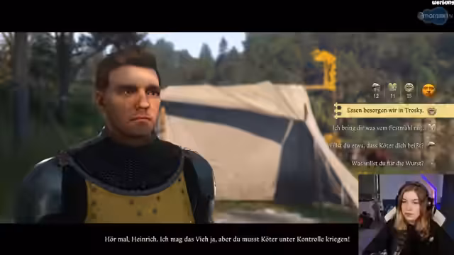 06:04:27Während der Erkundung stößt die Streamerin auf mehrere Nebenquests. Sie nimmt einen Auftrag an, um einen weißen Bullen zu färben, und erfährt von einem lang anhaltenden Streit zwischen Familien. Ein technischer Bug beim Würfelspiel blockiert ihre Bewegung, was durch Beenden und Fortsetzen des Spiels gelöst wird. Am Abend erwacht sie, fühlt sich hungrig und plant, den Stream bei Holla fortzusetzen, während sie sich über die nächsten Schritte im Spiel Gedanken macht.