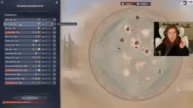 01:17:18Die Streamerin optimiert die Routen und Logistik in Anno 1800. Sie bemängelt, dass sie Produkte nicht nach Region oder Typ sortieren kann, und plant, die Route zu verdoppeln, um mehr Käse zu transportieren. Gleichzeitig überlegt sie, zusätzlich Bier mitzunehmen, da die Nachfrage hoch ist und die Produktion der Bierinsel ausreicht. Es wird eine neue Route zur Insel Brembe eingerichtet, um die Warenversorgung zu sichern.