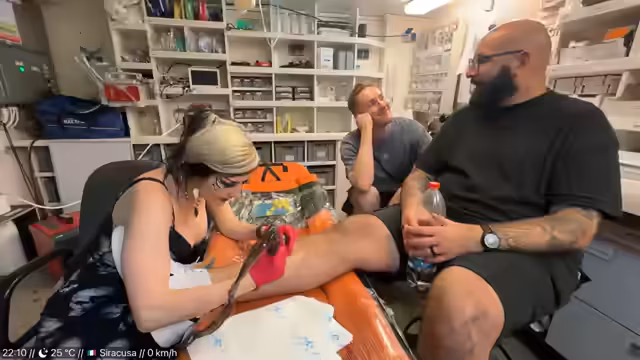 01:21:17Im Mittelpunkt steht ein Tätowierprojekt, bei dem ein großes SOS Humanity Logo gestochen wird. Dies ist eine symbolische Geste und Dankeschön an die Spender. Der Streamer reflektiert dabei seine eigene Tätowiergeschichte und das Erlebnis, sich spontan tätowieren zu lassen. Der Prozess wird als Gemeinschaftserlebnis und Teamwork dargestellt.