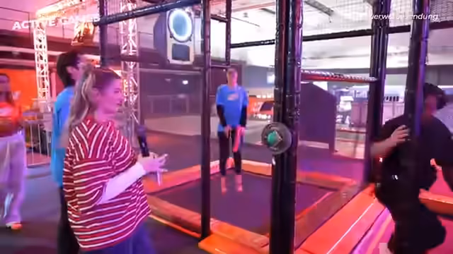 00:29:02Die zweite Challenge ist das 'Nerf Jump Duell', ein 1-gegen-1-Wettkampf auf einer Trampolinfläche. Jeder Teilnehmer erhält einen Nerf Blaster mit sechs Darts und muss versuchen, Darts in die gegnerischen Körbe zu feuern, während er sich bewegt und springt. Das Blocken von Darts mit dem Blaster ist erlaubt, aber das Zielen auf den Kopf und Nachladen ist verboten. Der Spieler mit den meisten Treffern gewinnt die Runde. Die Team-Kapitäne, Adi und Paul, treten als Erste gegeneinander an. Trotz Adis Behauptung, alle Darts getroffen zu haben, zählen nur die Darts, die im Netz bleiben. Pauls Treffer bleiben im Netz, was ihm den Sieg in dieser Runde einbringt. Es kommt zu einer Diskussion über die Netze, woraufhin ein Seitenwechsel für die nächste Runde vereinbart wird. Im nächsten Duell tritt Alpay für Team Orange gegen Selma für Team Blau an. Beide haben Schwierigkeiten, Treffer zu erzielen, und die Runde endet unentschieden mit 0:0. Das dritte Duell bestreiten Phil für Team Orange und Kahn für Team Blau. Kahn erzielt zwei Treffer, die im Netz bleiben, und gewinnt somit seine Runde. Damit gewinnt Team Blau auch die zweite Challenge, und der Gesamtstand erhöht sich auf 2:0 für Team Blau. Die Kommentatoren betonen die Dominanz von Team Blau und die Notwendigkeit für Team Orange, aufzuholen.