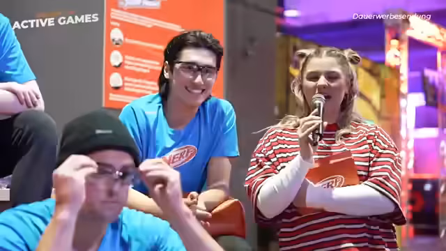 01:55:11Nach einem Unentschieden wird eine weitere Runde im Modus 4 gegen 4 ausgerufen, um eine Entscheidung herbeizuführen. Die Spannung steigt, da alle Teilnehmer erneut antreten müssen. Es wird schnell klar, dass nicht genügend Blaster vorhanden sind, was zu einer kurzen Unterbrechung führt, um die Ausrüstung zu organisieren. Der Chat fordert vehement ein 4 gegen 4, um maximales Chaos und damit eine größere Herausforderung zu schaffen. Die Spieler, darunter Rerex und Phil, die als Pro-Shooter-Player bezeichnet werden, bereiten sich auf die strategische oder chaotische Herangehensweise vor. Team Blau und Team Orange stehen sich gegenüber, wobei die Frage im Raum steht, ob sie aggressiv vorgehen oder ihre Basis sichern. Mit drei Shadowspeed Wrecking und einem Active Zero Striker sind die Teams ausgestattet. Nach Überprüfung der Sicherheitsbrillen und Regeln startet das Stechen, bei dem vier Punkte für den Sieg vergeben werden. Paul geht sofort ins Risiko, was sich als schwierig erweist, da die Sichtverhältnisse im Käfig begrenzt sind. Er wird getroffen und scheidet aus, was einen herben Rückschlag für Team Blau darstellt. Team Orange nutzt die Überzahl und strategische Ansagen von Adi, um Rerex ebenfalls auszuschalten. Trotzdem bleibt Team Blau durch Selma und Kahn im Spiel, die sich weiterhin behaupten.