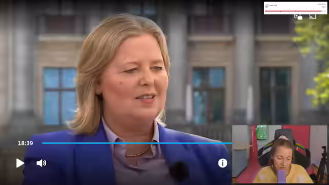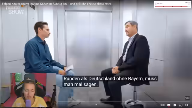 00:07:11Die Stimmung wechselt zur Politik. Die Streamerin vermisst politische Formate wie Maischberger, kritisiert aber die Moderation des Sommerinterviews mit Bärbel Bass scharf. Sie findet es "unnötig", dass Bass im Interview ständig auf ihr Geschlecht reduziert werde und es sich wie ein Interview aus den 90ern anfühle. Gleichzeitig bringt sie eine neue Hoffnung ins Spiel: Fabian Köster, der mit Markus Söder ein Aufzug-Interview gemacht hat. Sie zeigt große Bewunderung für Kösters Methoden und wünscht sich, diesen Stil auch in Deutschland zu sehen.