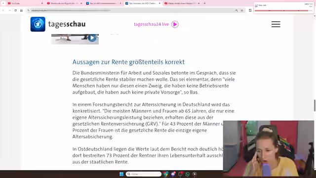 00:24:50Das Gespräch richtet sich auf das ARD-Sommerinterview von Bärbel Bass. Die Streamerin ist besorgt über die Zufriedenheitswerte der SPD-Chefin und die Entwicklung der Rente. Bass spricht über die Balance zwischen Rentensicherheit für die jetzigen Rentner und langfristiger Finanzierung, was als unzureichend empfunden wird. Die Streamerin kritisiert stark die Rentenpolitik der Regierung als Realitätsverweigerung, während Bass betont, dass eine Reform erst in der nächsten Legislaturperiode geplant ist. Die Höhepunkte des Interviews sind Bass' Verteidigung ihrer Rolle als einzige Frau im Koalitionsausschuss und ihr Plädoyer für mehr Frauen in Führungspositionen.