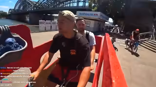 00:22:52Der Stream beginnt mit technischen Herausforderungen, die zu einer Verzögerung führen. Schließlich können Niki Stemmler und Paul Frege ihr Tandemrad, ein als London City Bus getarntes Fahrrad, präsentieren. Niki absolviert sein IRL-Debüt, und die Hauptziele des Tages werden vorgestellt: Die Fahrt von Köln nach Düsseldorf für das Red Bull Sattelfest und ein gemeinsamer Freundetag. Gleichzeitig wird die Notwendigkeit betont, das Fahrrad intakt zu halten, da es für den morgigen Wettbewerb benötigt wird. Die erste Kamera wird für den Stream installiert und ein Techniker steht zur Seite.