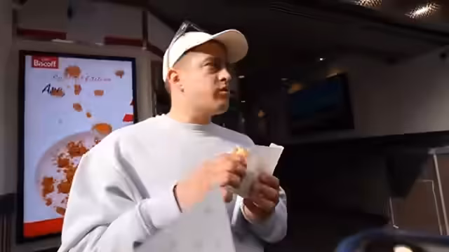 00:56:18Die Streamer erreichen einen der bekanntesten Coffeeshops Amsterdams, 'The Bulldog'. Sie beschreiben die schwierige Situation mit der Technik, die den Stream beeinträchtigt, wollen aber trotzdem durchziehen. Das weitere Ziel ist es, hier Interviews mit Verlassenenden zu führen. Vorher machen sie jedoch eine Pause, um sich zu stärken, und erkunden dabei lokale Essenskioske wie die typische 'Febo'-Automaten.