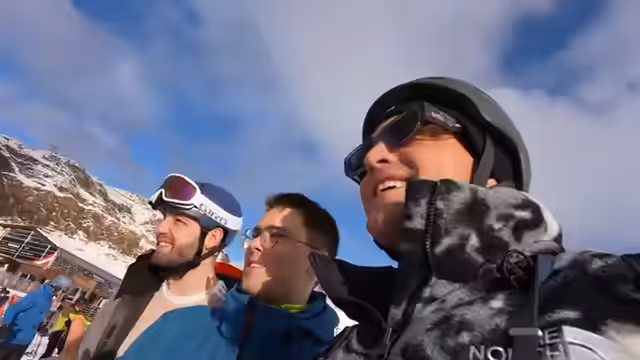 00:43:38Während der Vorbereitungen für das Skifahren treten technische Probleme mit den Kabeln der Kamera auf, die Paul mehrfach neu verlegen muss. Trotz dieser Herausforderungen starten sie schließlich ihre erste Abfahrt im Skigebiet bei perfektem Sonnenschein. Paul filmt aus verschiedenen Perspektiven und lobt die Aussicht in die Alpen. Sie diskutieren die Pistenbedingungen und die Vorfreude auf das folgende Snowboarden von Paul und Ski-Fahren von Niki, wobei sie auch kleinere Begegnungen mit anderen Skifahrern haben.