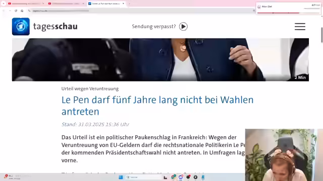 02:55:56Die dreimalige französische Präsidentschaftskandidatin Marine Le Pen wurde schuldig gesprochen, sich im Zentrum eines Systems zur Umleitung von Geldern im Europäischen Parlament befunden zu haben. Als Konsequenz wurde ihr für die nächsten fünf years die Kandidatur für öffentliche Ämter verboten, was ihre Pläne für die Präsidentschaftswahl 2027 zunichtemacht. Das Gericht bewertete die Handlungen als erwiesene Organisation. Die Partei des Rassemblement National kritisiert das Urteil als undemokratisch.