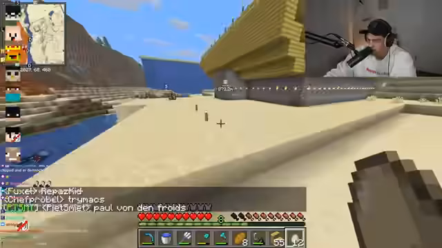 08:43:44Die Spannung steigt, als der Große Gladiatorenkampf näher rückt. Paul und Adi sind im Eifer des Gefechts dabei, das riesige Loch in der Umgebung fertigzustellen und mit Redstone und TNT zu versehen. Sie sind beeindruckt von der Komplexität der Maschinen, die Fabo gebaut hat, und müssen ihn hinzuziehen, um den Beacon korrekt zu platzieren. Der Fokus liegt darauf, die Vorbereitungen so schnell wie möglich abzuschließen.