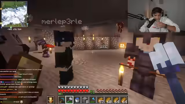 01:51:27Da für die Verzauberung der Rüstung weitere Erfahrungspunkte benötigt werden, wird eine Level-Farm genutzt. Der Streamer erklärt dem Chat und einem Begleiter genau, wie man effizient gegen Silberfische in einer speziell konstruierten Farm kämpft, um schnell Level zu farmen. Nach erfolgreicher Fertigstellung der Rüstung werden die Pläne für das große Bauprojekt konkretisiert. Der Streamer plant, in die 'Sexhain'-Gruppe zu wechseln, um mit den Mitspielern Hugo und weiteren Teilnehmern weiterzuplanen und zu interagieren.