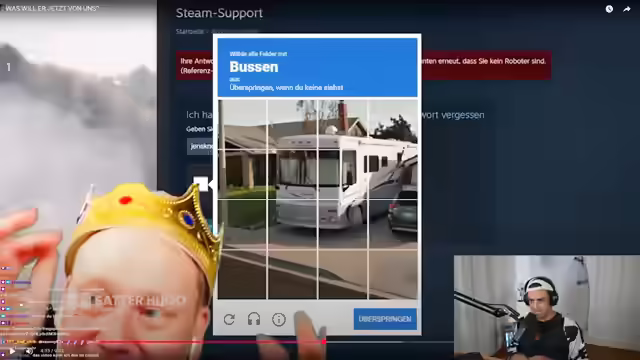 02:47:34Der Streamer verzweifelt an einer Reihe von Rätseln im Spiel Neil.Fun, darunter eine Aufgabe, bei der er ein küssendes Pärchen in einem belebten Bild finden muss. Trotz intensiver Suche und der Hilfe des Chats, der Hinweise wie „Bierbank“ gibt, tut er sich extrem schwer und äußert den Wunsch, die Aufgabe zu überspringen. Schließlich findet er das Pärchen mit Hilfe des Chats. Es folgen weitere Aufgaben wie ein Sehtest, das Zählen von Punkten und das Erkennen von Farbunterschieden, bei denen er aufgrund seiner Farbenschwäche erneut Schwierigkeiten hat. Eine besonders frustrierende Aufgabe ist das Verschieben von Blöcken, um eine bestimmte Anordnung zu erreichen, was ihn an den Rand der Verzweiflung bringt und er sogar ein Tutorial oder ChatGPT um Hilfe bitten möchte. Nach zahlreichen Fehlversuchen und der Unterstützung des Chats, insbesondere von 'Top, Top, Top 30', gelingt es ihm schließlich, das Blockrätsel zu lösen. Es folgen weitere Captchas, darunter eine Matheaufgabe, die er mit ChatGPT lösen möchte, aber erneut an der Sprachfunktion scheitert. Schließlich gibt er bei einer Aufgabe auf, bei der er KI-generierte Männer identifizieren soll, da er keinen Unterschied erkennen kann. Er beendet das Spiel mit einer letzten Parkaufgabe und dem Betrachten von YouTube-Kommentaren zu seinem Video, bevor er den Stream beendet, um sich von seiner Erkältung zu erholen und kündigt einen Minecraft-Stream für den nächsten Tag an.