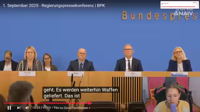 Es wurde ein Ausschnitt der Bundespressekonferenz gezeigt, der sich mit der Position der Bundesregierung zum Gazakrieg befasst. Die deutsche Regierung vertritt gegenüber EU-Sanktionen eine vorsichtige Haltung, die in der internationalen Presse als Blockade wahrgenommen wird. Dies wird mit der offiziellen Darstellung der Regierung kontrastiert.