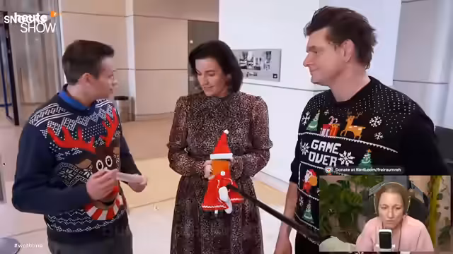 02:58:27Parodistische Geschenkübergabe an Politiker: Merz wird als narzisstisch kritisiert (Bild in Botschaften), Söder mit einem 'kein Bild von Söder'-Geschenk verulkt und Laschet als nicht ernst genommen dargestellt. Die Satire thematisiert Regierungsarroganz, SPD-Internalien (z.B. Nahles-Gesang) und nutzt dabei Weihnachtsmotive für gesellschaftskritische Pointen, etwa durch fiktive Anti-Stress-Bälle von Merz.