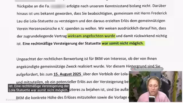 01:33:42Das Kulturministerium forderte später die Rückgabe der Statue und den Nachweis des Erlöses, obwohl die Versteigerung schon stattfand und der Streamer keinen Kaufvertrag mit dem Ministerium hat. Er kritisiert die späte Reaktion und erklärt, warum er die Anfragen ignoriert, da die Statue legal erworben und versteigert wurde.