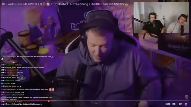 01:23:52Die Gruppe spricht über das Incident bei Let's Dance, bei dem RTL die Gruppe fast des Studios verweisen wollte. Max Schradins Video dazu wird gezeigt, der die Vorfälle aus seiner Sicht schildert und die Gruppe als 'asozial' bezeichnet. Anschließend macht Paul eine Aprilscherz-Beichte, er habe sein gesamtes Geld für eine neue Kamera ausgegeben und sei pleite. Der Stream wird durch technische Schwierigkeiten mit der Bildqualität unterbrochen, die jedoch behoben werden können. Die Ankündigung neuer Songs und ein exklusiver Song-Leak schließen den Abschnitt ab.