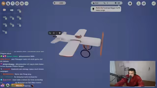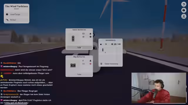 02:42:01Der Stream beginnt mit dem Versuch, ein Flugzeug für Transportaufträge umzubauen. Es wird versucht, große Batterien zu laden, aber der benötigte Platz von 55 Einheiten überschreitet die verfügbare Kapazität von 40. Nach mehreren Umbauten und einem Gespräch über die mangelnde Eignung des Streamers als Pilot wird das Flugzeug als „Elon Musk-Rakete“ verspottet. Nach einem Start, der als „geil“ bezeichnet wird, stellt sich heraus, dass das Flugzeug sich schlecht steuern lässt und viel verbraucht. Der Streamer kämpft mit dem Handling und muss das Flugzeug ständig nach oben halten, um nicht abzustürzen.