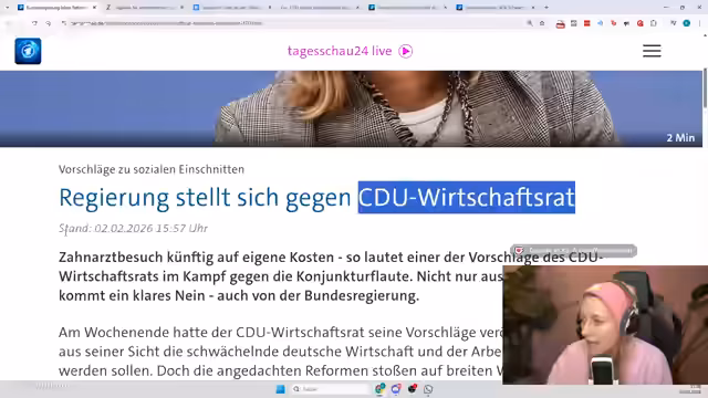 00:33:48Der Streamer stellt die zentralen Forderungen des Vereins vor, insbesondere der Vorschlag, zahnmedizinische Behandlungen nicht mehr von der gesetzlichen Krankenkasse, sondern privat bezahlen zu lassen. Er zitiert die scharfe öffentliche Kritik darauf durch die Bundesregierung und Bundesgesanzheitsministerin Nina Wagenknecht, die dies als Abkehr vom Solidarsystem ablehnt. Auch der Arbeitnehmerflügel der Union, die CDA, lehnt die Vorschläge als für die Wählerschaft gefährlich ab.