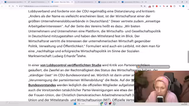 00:25:48Der Streamer erläutert die genaue Natur des "CDU-Wirtschaftsrats e.V.". Er klärt auf, dass es sich dabei nicht um eine offizielle Parteiorganisation, sondern um einen eigenständigen eingetragenen Verein handelt, der sich seine Mittel durch Mitgliedsbeiträge erwirtschaftet und rechtlich sowie finanziell unabhängig von der CDU ist. Er nennt die Kritik von Lobby Control, der Verein sei einer der größten Unternehmenslobbyverbände Deutschlands, und hebt hervor, dass laut CDU-Bundesvorstand der Verein keine offizielle Vertretung in der Partei habe.