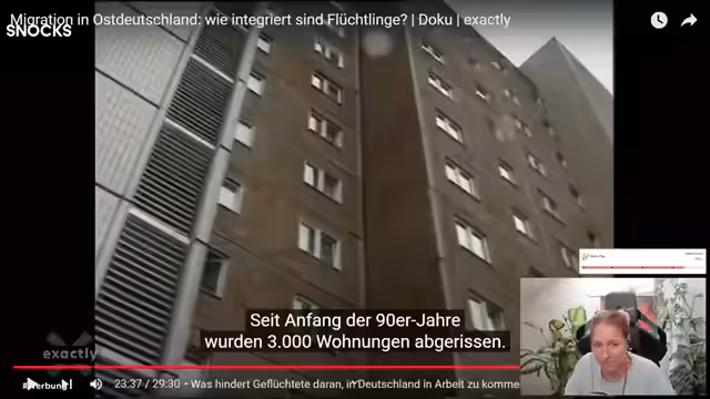 00:09:21Das zentrale Thema des Streams wird die Dokumentation 'Migration in Ostdeutschland – Wie integriert sind Flüchtlinge?' des MDR. Der Streamer äußert seine anfängliche Überraschung über die Präsenz von Migranten in Ostdeutschland. Die Dokumentation zeigt die alltäglichen Herausforderungen in einem Plattenbauviertel in Neubrandenburg, wie Sprachbarrieren und Konflikte mit der Hausordnung. Die gezeigte Ungeduld bei der Kommunikation wird kritisch hinterfragt.