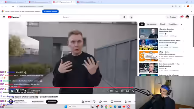 00:55:50Der Streamer zeigt seine hohe Vorfreude auf ein zweitäges altes Tomatolix-Video über die Steuerfahndung. Er erzählt von einer Begegnung mit Tomatolix auf einer Weihnachtsfeier, bei der er ihn als sehr angenehmen und ruhigen Typen kennengelernt hat. Aufgrund seiner positiven Eindrücke und seiner Bewunderung für die Videos von Tomatolix, mit dem er mittlerweile im selben Management ist, entscheidet er sich, dieses Video direkt im Stream zu rezipieren und mit seiner Community zu teilen.