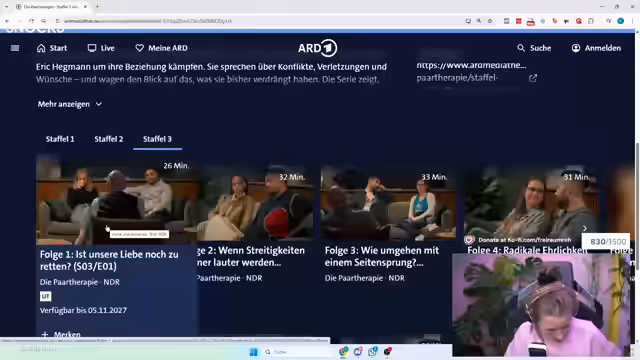 00:09:57Für den heutigen Freitag kündigt der Streamer ein entspanntes Programm an, das sich auf zwischenmenschliche Themen konzentriert und bewusst auf Politik verzichtet. Es steht zur Wahl, entweder die aktuelle Staffel von Manhunt oder die neue Staffel der Paartherapie von Anfang an zu schauen. Eine Umfrage wird gestartet, um die Präferenz der Zuschauer zu ermitteln. Es wird betont, dass die Paartherapie ein emotionales Format ist, das zum Mitreden über Beziehungen, Liebe und Sex einlädt. Die Entscheidung für die Paartherapie wird später durch die Abstimmung der Community bestätigt, wobei die neue Staffel, die erst vor zehn Tagen erschienen ist, komplett angeschaut werden soll. Das Format ist für seine Ehrlichkeit bekannt, da es nicht geskriptet ist und reale Paare während ihrer Therapie begleitet.