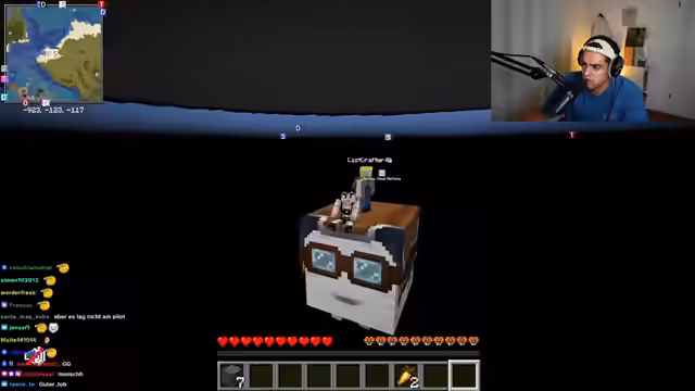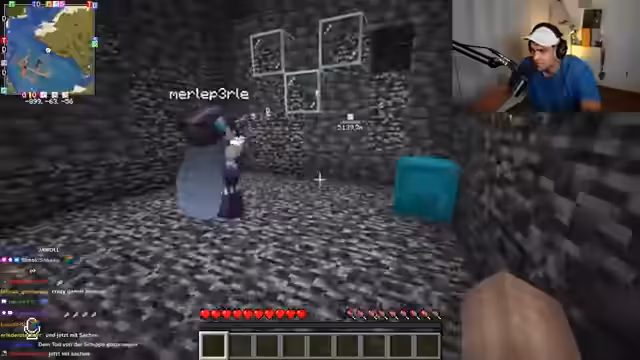 03:59:51Nach Stegis unerwartetem Sturz in den Void beginnt eine fieberhafte Rettungsaktion. Die Spieler versuchen, seine Stasis-Kammer zu finden, um ihn zurückzuteleportieren, da ein direkter Rettungsflug mit einem Ghast aufgrund der Tiefe und der Größe der Kreatur schwierig erscheint. Es wird diskutiert, wie Stegi in den Void fallen konnte, wobei vermutet wird, dass es ein unabsichtliches Herunterspringen war, das durch das sogenannte 'Call of the Void' ausgelöst wurde. Währenddessen werden weitere Ghasts vorbereitet, um möglicherweise einen erneuten Rettungsversuch zu starten. Der Streamer ändert den Streamtitel, um die aktuelle Situation widerzuspiegeln, da der Fokus nun auf den Experimenten und der Rettung liegt, anstatt auf der ursprünglich geplanten Explosion. Die Suche nach Stegis Stasis-Kammer gestaltet sich schwierig, da sie sich wahrscheinlich in seiner Basis befindet. Die Spieler kommunizieren über Discord, um die genaue Position zu lokalisieren und eine schnelle Rettung zu ermöglichen.