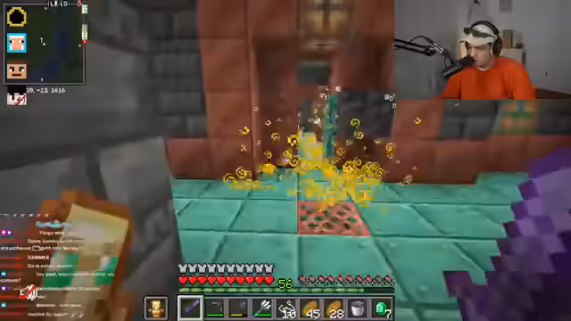 03:39:11Das Kupfer-Farming in den Trial Chambers schreitet zügig voran. Der Streamer beschreibt den Prozess als stabil, aber auch stumpf. Er vergleicht seine Farm mit der, die er alleine gemacht hat und kommt zum Schluss, dass die gemeinsame Arbeit in einem Team effektiver ist. Ein Spawner, der in der Nähe der Farm liegt, sorgt für zusätzliche Action und Loot.