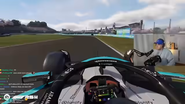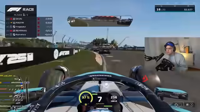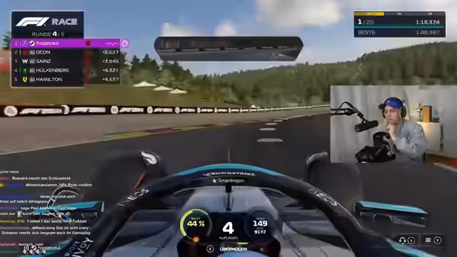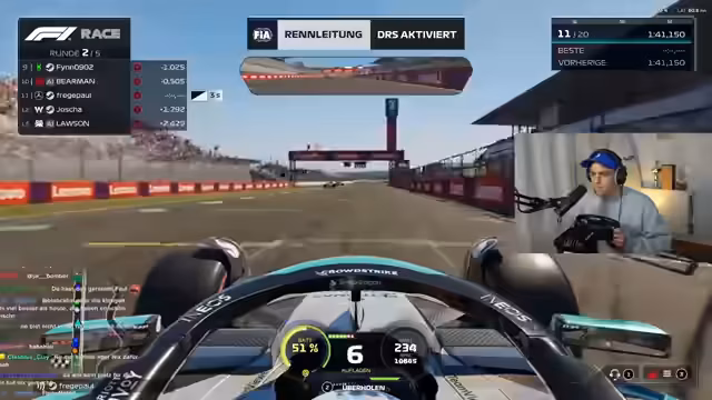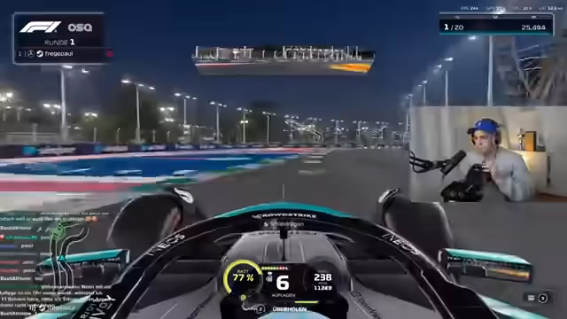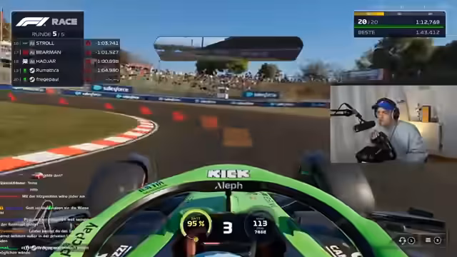 01:03:05Der Stream beginnt mit der Ankündigung eines gemeinsamen Formel-1-Streams mit Romatra für den Elis Cup am Montag. Es besteht die Möglichkeit, dass Zuschauer mitfahren können. Nachdem der Streamer ein Rennen auf der Österreich-Strecke startet, kommt es zu einem schweren Unfall, der zu erheblichem Schaden am Fahrzeug führt. Dies führt zu einem sofortigen Rennabbruch, da der Wagen nicht mehr fahrtauglich ist. Nachfolgend treten weitere technische Schwierigkeiten mit dem Mikrofon auf, das ständig abfällt und die Sprachqualität massiv beeinträchtigt.