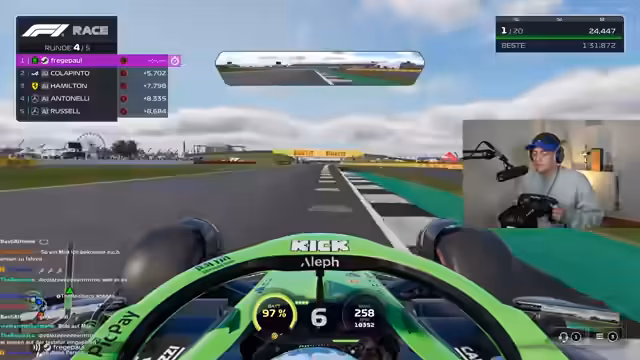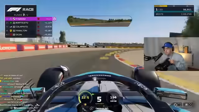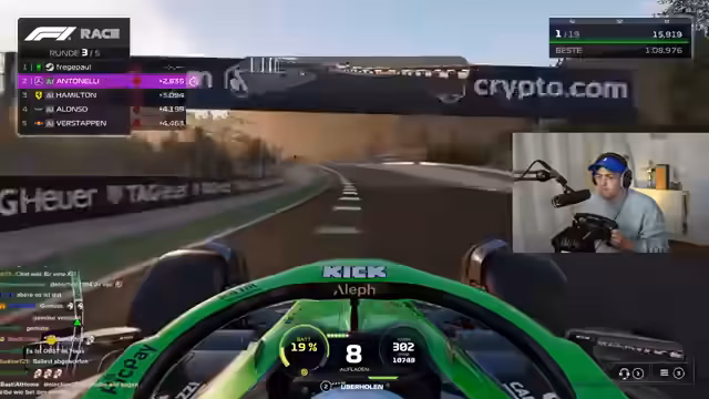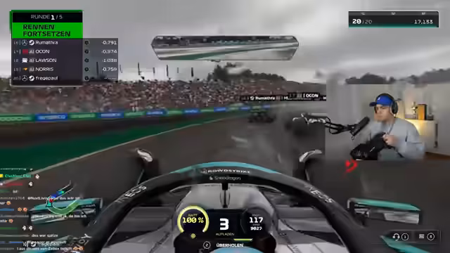 07:44:43Während der Rennen kommt es zu zahlreichen Kontakten und Kollisionen, die der Streamer als Teil des harten Wettbewerbs ansieht. Er beschreibt Situationen, in denen er von anderen Fahrern gerammt wird, selbst aber auch umsichtig fährt. Entscheidende Manöver, wie das Kaputmachen des Frontflügels eines Konkurrenten, werden als strategisch beschrieben, da dieser dadurch anschließend langsamer wird und fallen gelassen wird. Eine Strafzeit aufgrund einer Kollision wird als frustrierend, aber als Teil des Wettkampfs betrachtet.