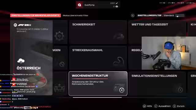 01:32:48Nach mehreren erfolgreichen Runden, die zur Vorbereitung dienten, endet das Training für den Moment. Der Streamer ist sehr zufrieden mit seiner gefahrenen Performance und dem Setup. Nachdem Romatra ebenfalls live ist, wird versucht, ein gemeinsames Rennen zu starten. Nach anfänglichen technischen Hürden bei der Einladung und der Spieleinstellung, gelingt es schließlich, eine private Lobby zu erstellen, in der nur die beiden fahren, um ihr gegenseitiges Niveau zu testen.