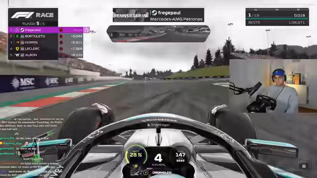 04:57:42Der Streamer berichtet von seiner Teilnahme an einem Rennen, bei dem er nach einem Vorfall in der Boxengasse eine Zeitstrafe erhielt und eine Durchfahrtsstrafe als notdürftige Lösung ansah. Im weiteren Verlauf des Rennens stellte er fest, dass sein Flügel beschädigt war, was die Fahrzeugkontrolle, insbesondere in Kurven, beeinträchtigte. Trotz der technischen Schwierigkeiten gelang es ihm, eine schnelle Rundenzeit zu fahren, was ihn motivierte, weiterzujagen und seine Position zu verbessern.