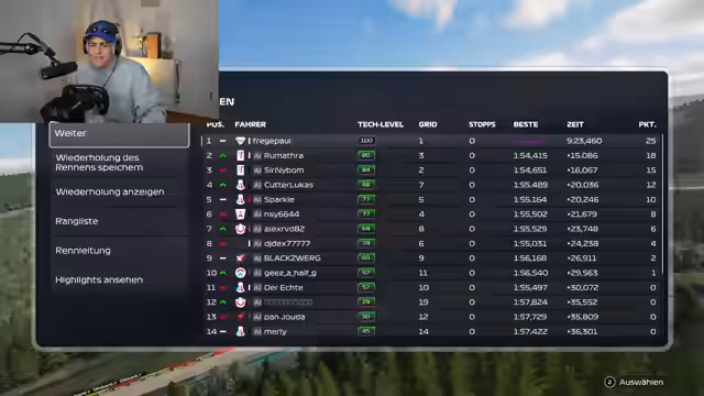 06:55:04Ein gemeinsames Rennen nach der Essenspause gestaltet sich holprig. Beide Spieler kämpfen mit der Einstellung und haben technische Ladeprobleme. Während eines Rennens wird ein illegales Überholmanöver beanstandet, was zu einem Streit führt. Trotzdem wird der Fokus gelegt, sauber zu fahren, und die Körperlänge des Simulationsfahrens wird diskutiert.