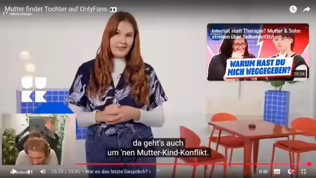 00:57:20Fenjan zeigt das offizielle Startvideo des Formats 'Das letzte Gespräch', in dem Lisa-Sophie die Geschichte von Maja und Petra vorstellt. Maja hat ihrer Mutter heimlich von ihrem OnlyFans erzählt und durch ein Reel auf Instagram entdeckt. Die Mutter zeigt sich geschockt und kann nicht verstehen, warum ihre Tochter sich 'pornografisch' darstellt. Es entsteht ein schwerwiegender Konflikt in der Mutter-Tochter-Beziehung, der im weiteren Verlauf des Videos beleuchtet wird.