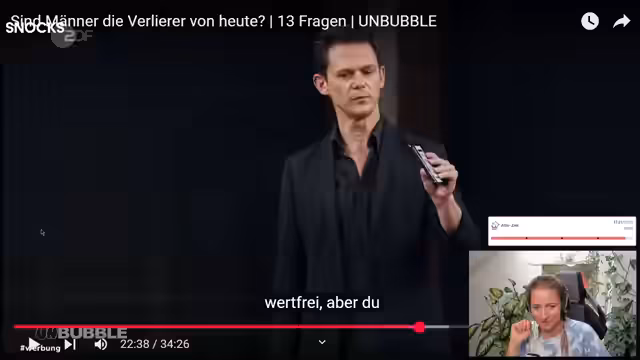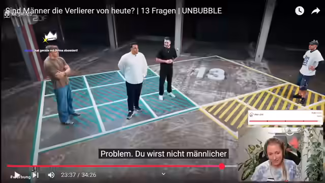 00:12:10Im Fokus des Streams steht die Analyse des aktuellenFormats "13 Fragen: Sind Männer die Verlierer von heute?". Die Streamerin entwickelt eine differenzierte Position, die über eine einfache Ja/Nein-Aussage hinausgeht. Sie argumentiert, dass Männer im Zuge des Feminismus zunächst Privilegien abgeben müssen, aber langfristig von der Entlastung traditioneller Rollenerwartungen profitieren. Sie kritisiert toxische Männlichkeit als schädlich für beide Geschlechter und verweist auf Statistiken wie die höheren Suizidraten bei Männern, ohne diese zu vereinfachen oder zu instrumentalisieren.