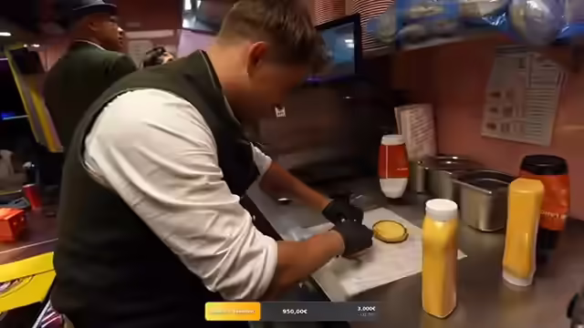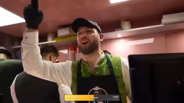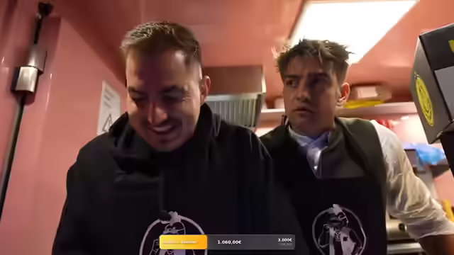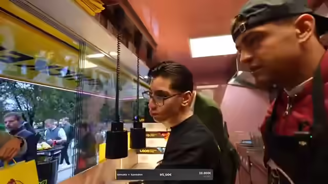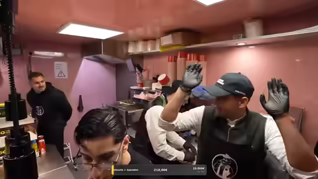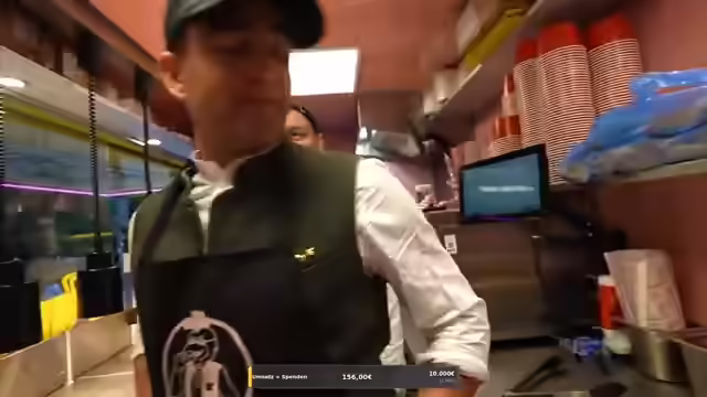 07:16:03Ein TikTok-Star und Kaktus-Kicker überrascht mit einem Besuch. Es wird kurz auf die Kings League eingegangen, aber der Fokus liegt darauf, dass der Überraschungsgast beim Frittieren hilft. Es wird erwähnt, dass die Spenden bereits bei 1300 Euro liegen, obwohl das ursprüngliche Ziel höher gesteckt war. Die Qualität der Burgerzubereitung scheint zu schwanken, wobei einige Burger genau richtig und andere fehlerhaft sind. Es wird über die Beschriftung der Burger gesprochen und darüber, wie Kunden reagieren könnten, wenn sie anstößige Beschriftungen entdecken. Es wird festgestellt, dass die Mitarbeiter genervt sind, weil Bestellungen nicht abgeholt werden und die Nummern zufällig aufgerufen werden. Es wird die Idee geäußert, dass nur Paul nicht einstellbar sei, während andere Mitarbeiter gelobt werden.