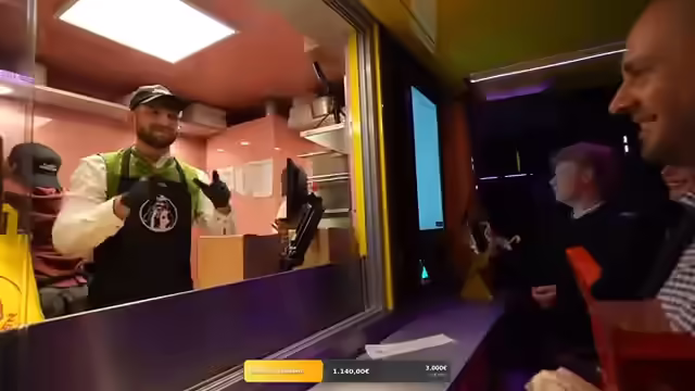 01:28:44Es wird Platz für Carla gemacht und die Arbeitsverteilung wird besprochen: Friteuse startet Paul. Es wird betont, dass man erst zuhören muss. Es wird auf die Station verwiesen und gefragt, wo die eigene Station ist. Es wird gefragt, ob Trinkgeld als Umsatz zählt. Es wird gesagt, dass man nicht die Schnellsten, aber dafür die besten Burger sein wird. Es wird gefragt, was die Leute überhaupt wollen und ob es nur Burger gibt. Julie soll Carla unterstützen. Es wird erklärt, wie man die Fritteuse bedient und Timer benutzt. Das vorbereitete Chicken und die Pommes werden gezeigt. Es wird gesagt, dass man heimlich snacken wird. Es wird betont, dass alle mit Hunger gekommen sind und Burger für sich machen wollten. Es wird auf die Hitze des Chickens hingewiesen. Es wird eine Qualitätskontrolle der Pommes durchgeführt. Theresienhöhe 5 wird als Standort genannt und dazu aufgerufen, vorbeizukommen. Es wird betont, dass alle Ausgaben zu 100% gespendet werden. Die Saucen werden gelobt. Es wird gefragt, ob das Essen heile ankommt. Es wird erklärt, wie die Chicken verpackt werden. Es wird gesagt, dass die Kunden sich beschweren, weil nur gegessen wird. Es wird erklärt, wie die Bestellungen aufgenommen und bearbeitet werden. Stifte gehen immer vom Lohn ab. Es wird gesagt, dass alle wieder zuhören sollen.